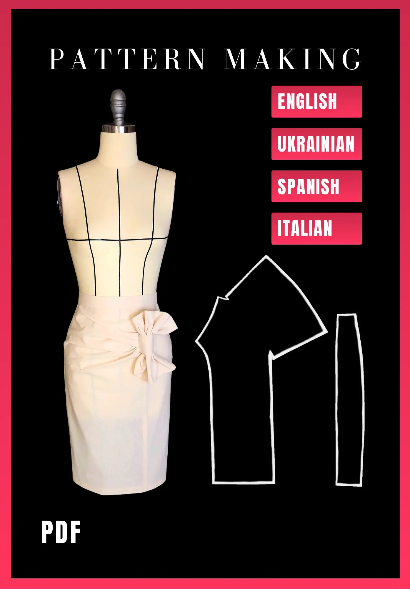 This design includes two techniques at the same time: creating an asymmetric drapery and creating a built-in bow. The standard size of the mannequin is used. Measures are given in centimeters. In the tutorial you will find a basic skirt pattern in scale for practice.